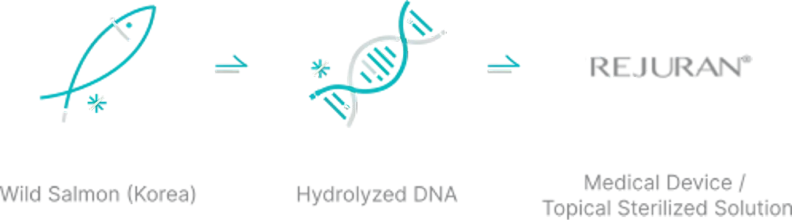The process begins by obtaining the highest purity Hydrolyzed DNA from wild Chum Salmon (Oncorhynchus keta) using Rejuran DOT™. We choose Chum Salmon as its DNA closely matches human nucleotides of Adenine, Cytosine, Guanine, and Thymidine (ACGT), making it the best choice for regenerative skin health.